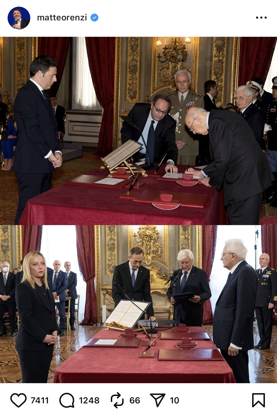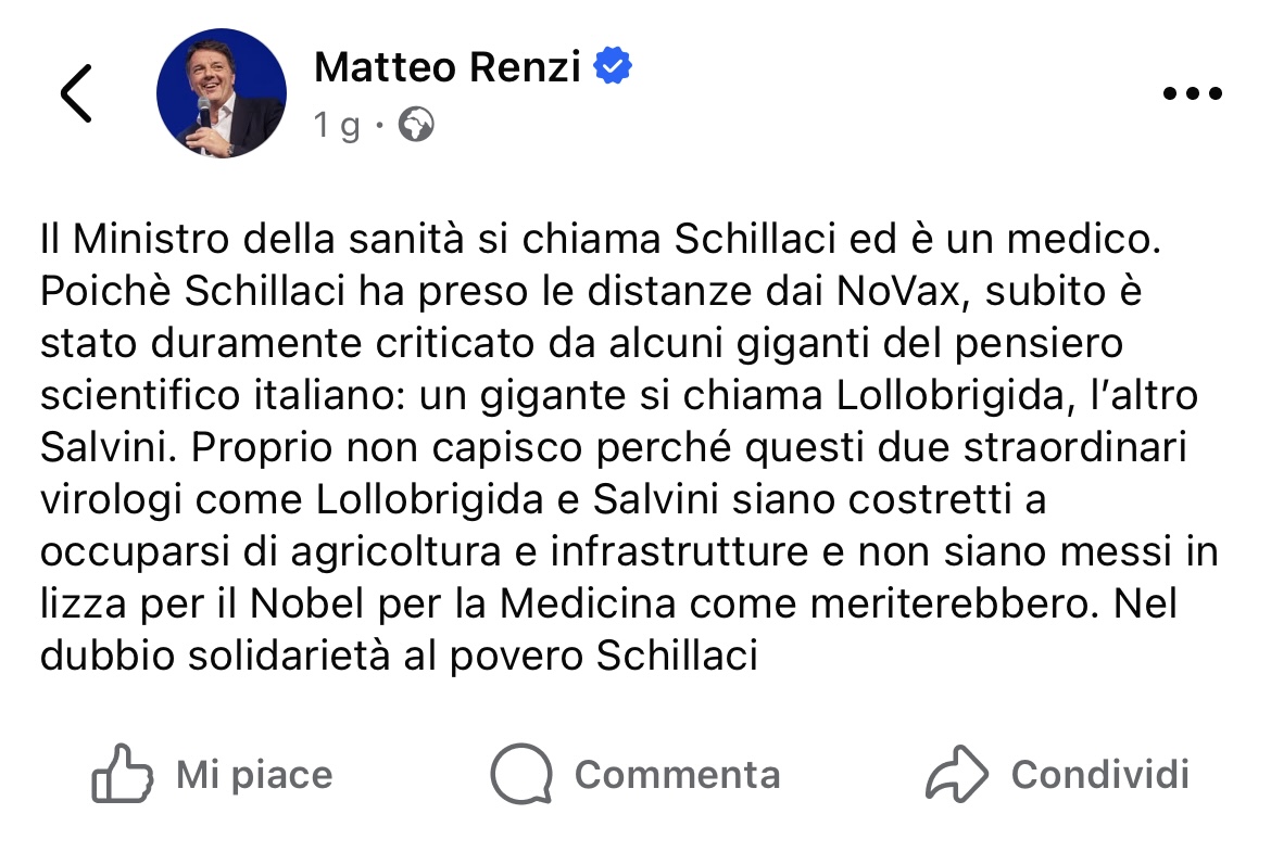 Giorgia Meloni si è molto rallegrata per aver superato il record di longevità del mio Governo. Mi fa piacere che l’Italia sia diventata un Paese stabile. Non mi convince il fatto che per restare al Governo abbiano scelto la strada del non fare nulla. In questo post del 12 agosto ho chiesto agli amici dei social e anche agli elettori della Meloni felici di averci superato per longevità del Governo, di indicare qualche riforma. Giudicate voi stessi dal mio post e soprattutto dai commenti.