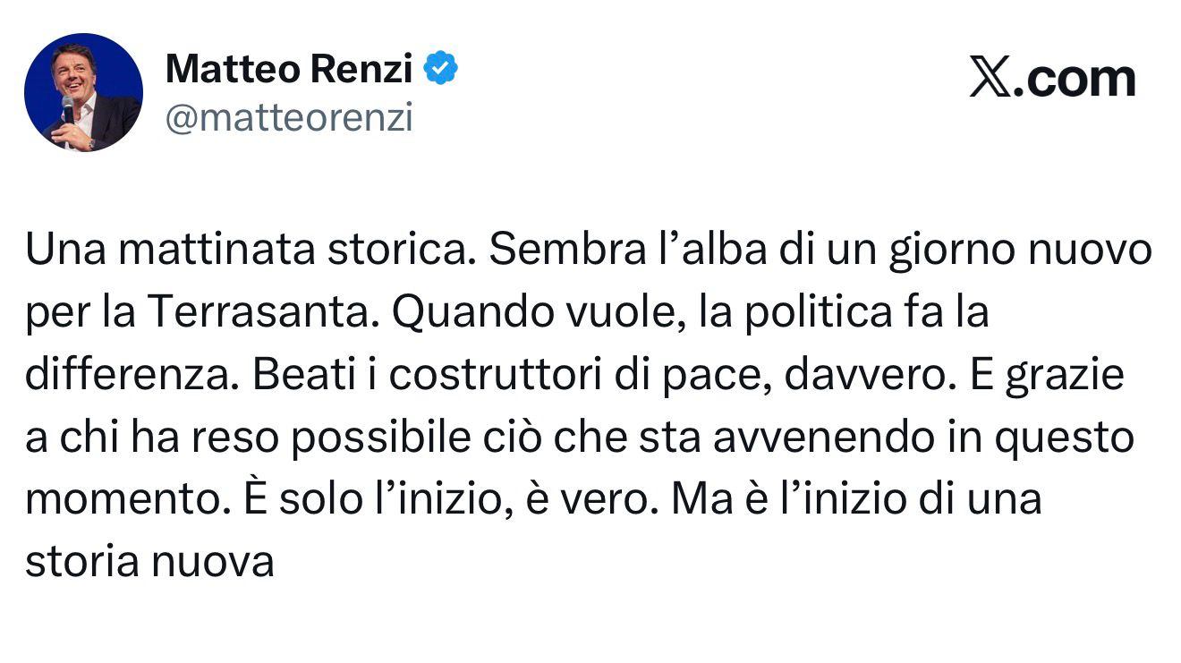 - Politica estera. Le immagini che arrivano da Israele e da Gaza sono immagini bellissime, le immagini di una tregua attesa da troppo tempo. Le immagini di una pace che potrebbe scoppiare davvero. Successo politico di Donald Trump, grazie al decisivo aiuto di Jared Kushner e di Tony Blair oltre che al supporto fondamentale dei paesi arabi. Tutto risolto? Ovviamente no. I costruttori di pace troveranno ostacoli tutti i giorni. Ma per i bambini di Gaza e di Tel Aviv si apre una stagione di speranza come non si vedeva da decenni. E chi vuol bene a quei popoli oggi è felice: due popoli, due Stati, questa la nostra bussola. Ne ho parlato in TV nei giorni scorsi , in questo post (ieri) e lo farò domani in Senato intervenendo sulle comunicazioni di Tajani.